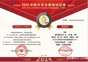 12月8日,2024年中国大学生英语辩论赛CUDC全国总决赛顺利收官。经过激烈的角逐,优米娱乐纸牌张巍副教授指导的22级商英专业赵一帆和22级翻译专业刘敏军两位同学凭借充足的赛前准备,在辩论赛中展现精彩的论述,观点清晰,逻辑严谨,经过层层角逐,荣获全国二等奖。赵一帆同学凭借其出色的辩论,荣获最佳辩手奖。