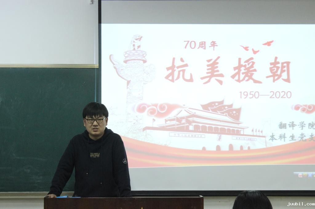 活动伊始,王峰同志围绕“抗美援朝70周年”这一主题向学生党员介绍了抗美援朝大事记,并指出抗美援朝战争的国内意义与国际意义。随后,全体党员一同观看了习近平总书记在纪念中国人民志愿军抗美援朝作战70周年大会上发表的讲话。习近平总书记在大会中提出要在新时代继承抗美援朝的革命精神,铭记伟大胜利,推进伟大事业,促进新时代中国的特色发展,无比坚定与自信地向着实现伟大复兴的中国梦奋勇前进。学生党员纷纷表示要继承弘扬抗美援朝精神,向抗美援朝英雄学习,做新时代的奋斗者和青年先锋。