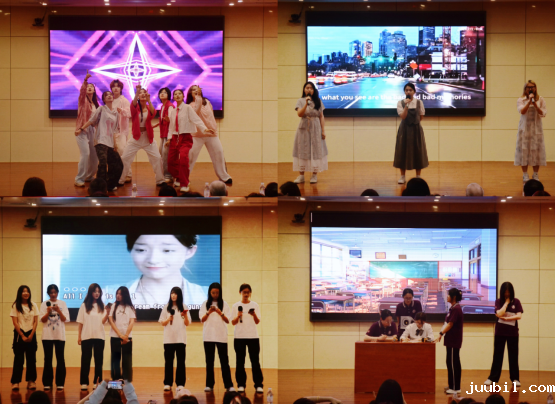 音乐会以“BEMS ON FIRE”为主题,融合歌舞、话剧与配音等多元艺术形式,充分展现商务英语专业特色。开场舞《Boy With Luv》以明快节奏与灵动舞姿迅速点燃现场气氛。双语改编版《Take Me To Your Heart》巧妙融入商务社交场景,在悠扬旋律中彰显跨文化交际的独特魅力。歌曲《See me 4 me》的演唱者以极具感染力的唱腔搭配精准发音,实现了情感表达与专业技巧的完美融合。改编话剧《Snow White》大胆创新,将经典童话重构为商业谈判情境,角色之间以流畅的英文展开激烈博弈,碰撞出全新的戏剧张力。《小猪佩奇》配音节目凭借对原版角色语音语调的高度还原与精准的英语发音,充分展现出翻译学子扎实的语言功底和深厚的专业素养。