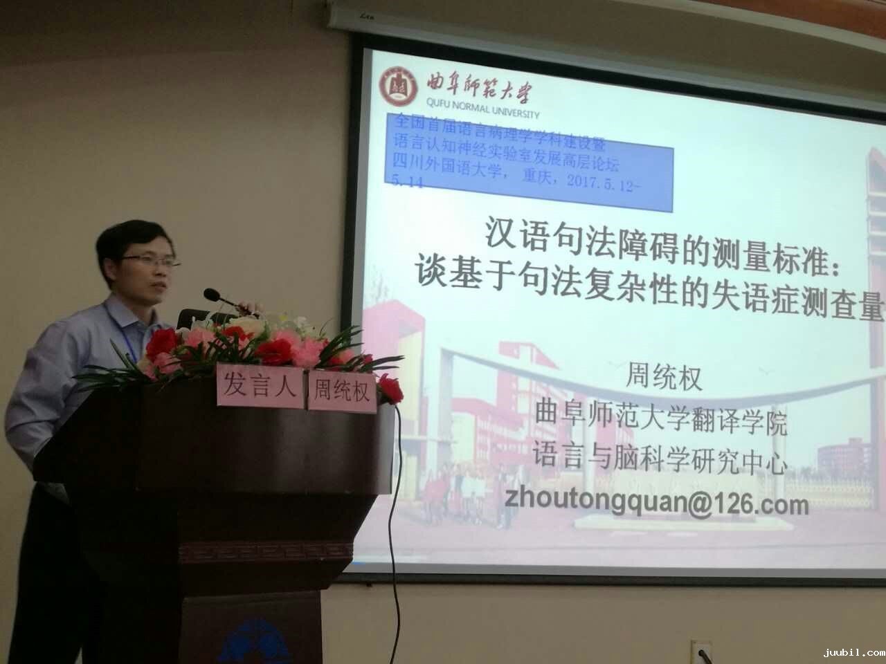 5月12日-5月14日,由四川外国语大学语言脑科学研究中心、北京语言大学语言康复学院,上海交通大学言语-语言-听力研究中心和中国认知神经语言学研究会共同主办的全国首届语言病理学学科建设暨语言认知神经实验室发展高层论坛在四川外国语大学隆重举行,来自全国医学、心理学和语言学界的30多位专家、学者共聚一堂就各类语言疾病的预防、治疗与康复进行了深入探讨,部分医学院和脑科学研究中心还介绍了创办神经语言学实验室和语言康复中心的经验和遇到的困难。我院语言与脑科学研究中心的周统权教授应邀出席了会议,并作了题为“汉语句法障碍的测量标准:谈基于句法复杂性的失语症测查量表”的大会发言,引起与会者的广泛关注和极大兴趣。