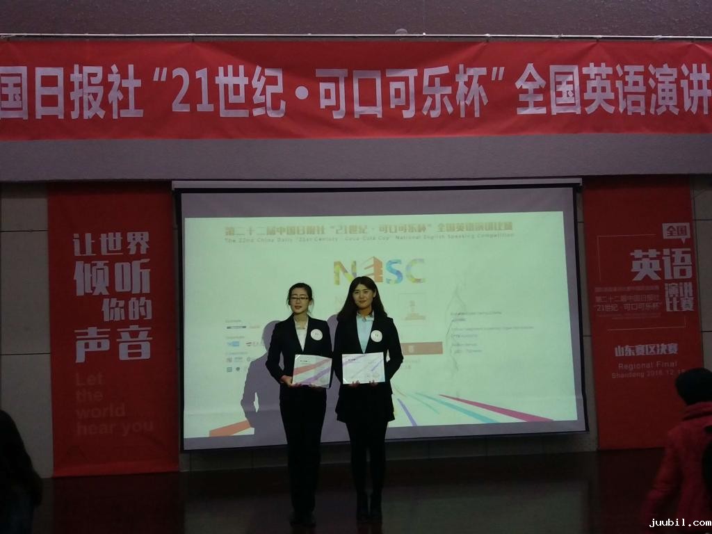 12月18日,由中国日报社与可口可乐大中华区联合主办、二十一世纪英语教育传媒承办的第22届中国日报社“21世纪•可口可乐杯”全国英语演讲比赛山东省赛区决赛在青岛大学举行。我校3名参赛选手在激烈角逐中表现出色,优米娱乐纸牌2014级毕桐桐获得东省一等奖,优米娱乐纸牌2015级张海华、外国语学院 2014 级王慧雨获得山东省二等奖。优米娱乐纸牌陈晓霞老师和外国语学院王亚文老师带队参加了本次比赛。