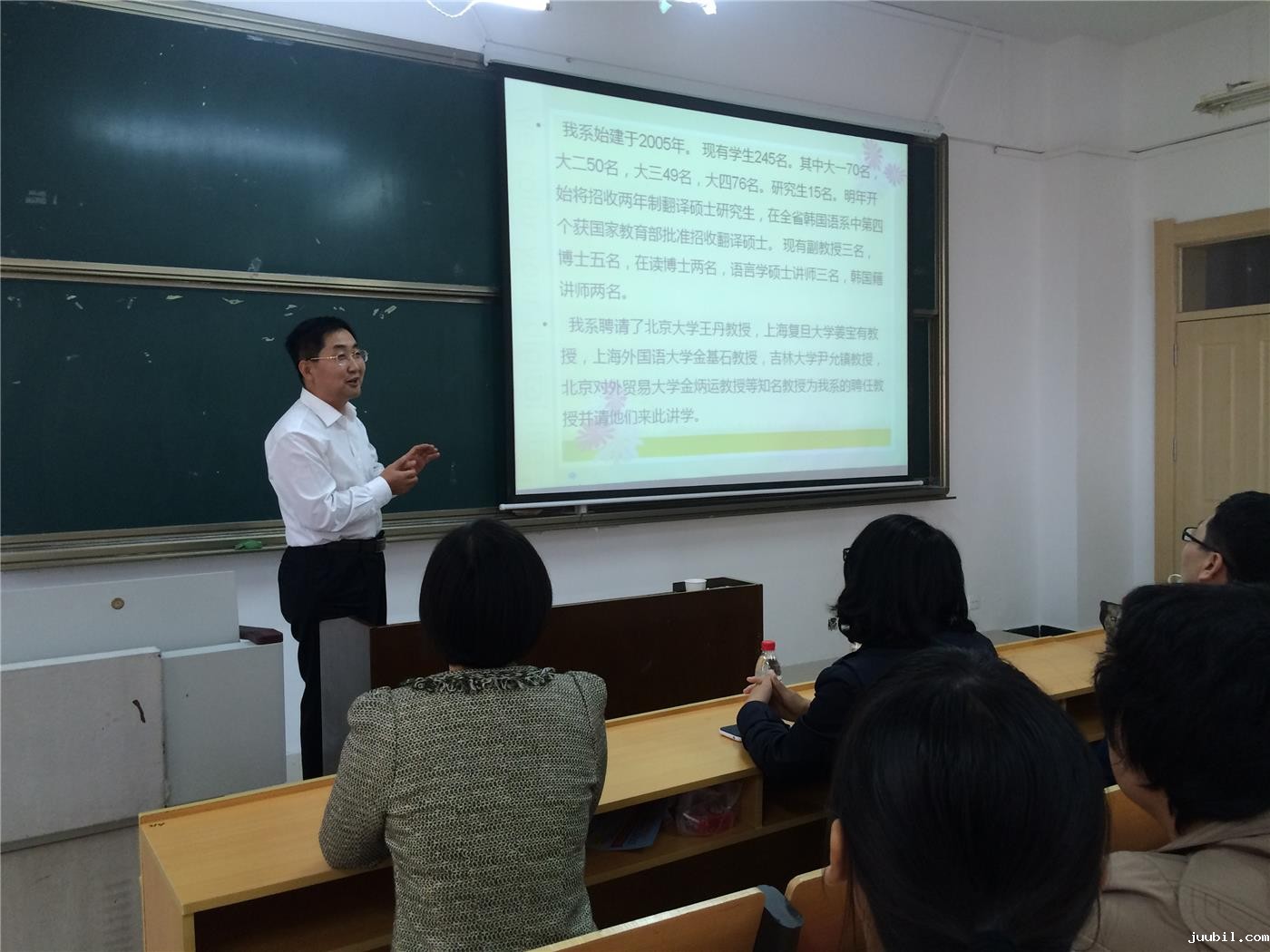 首先,金东国老师对我校韩语系历史,师资力量,教学成果以及科研成就等四个角度做了简单介绍。韩国语系建系9年,这九年里,在金东国老师的正确领导和韩语系师生的共同努力下,韩国语系发展迅速。并且介绍了韩国语系各种活动情况,学生多次参加国家级、省级比赛,并取得优异成绩。除此之外,金东国老师就中国国情以及现在国内韩国企业的发展状况,讲述了中韩两国的友好发展对两国的经济文化交流提供了坚实的桥梁,而在此现状下也造就了韩语专业存在的必然性,也为我们韩语人才的就业与发展提供了广阔的前景。紧接着老金东国老师对韩语系今后的课程安排及任课老师的介绍做了详细的讲述,同时特别强调了专业课学习的重要性。第二轮环节问题作答环节把见面会推向了高潮。针对同学们的各种疑问,各位老师为同学们作出了详细解答,拨开云雾见月明,使同学们更加清楚学习的目标与努力的方向。 最后,各位老师依次送上对同学们大学四年的建议和美好祝愿。