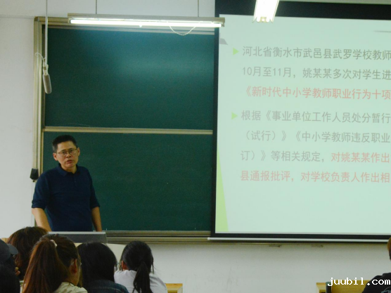 为让师德教育更具实效性,宋晓凯通过“正面榜样 + 反面警示”的案例对比方式,既分享了优秀教师扎根教育、关爱学生的感人事迹,展现师德师风的正能量,也结合教育领域违规违纪典型案例,深刻剖析失德失范行为对学生、学校及教育行业的危害,让同学们直观认识到“坚守师德底线”的重要性与必要性,进一步强化职业道德敬畏心。